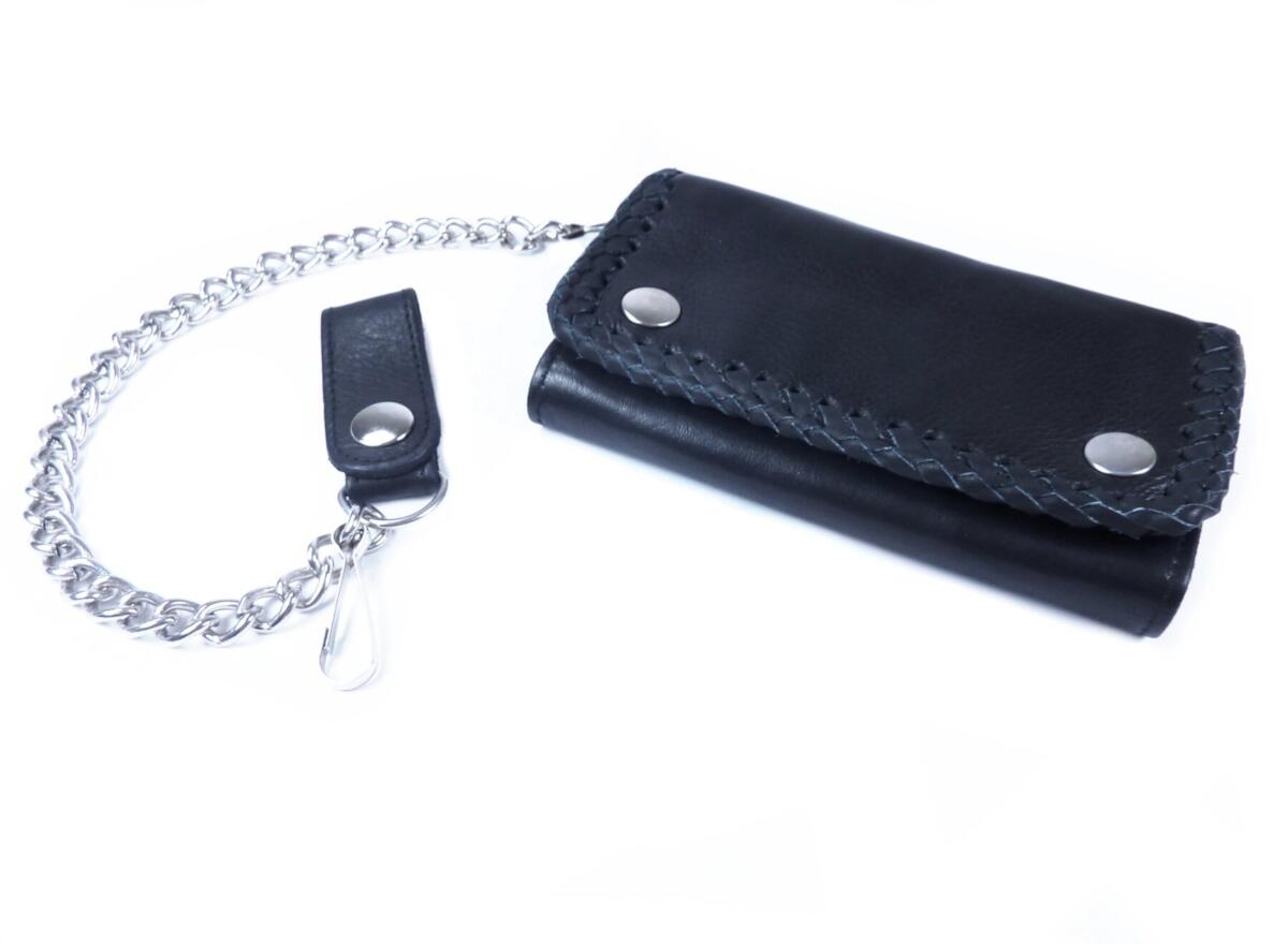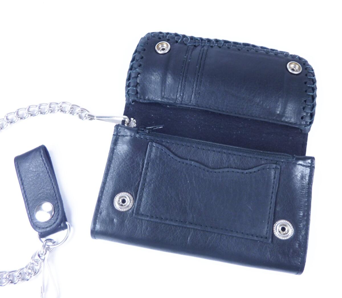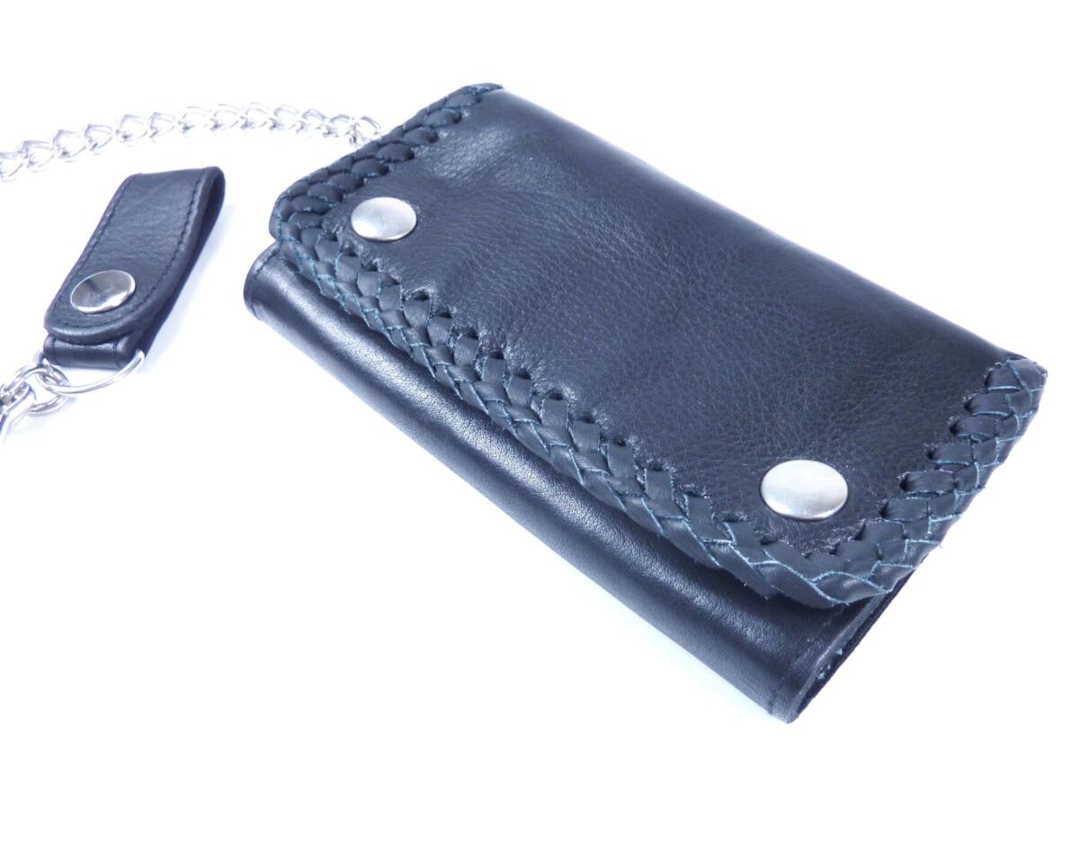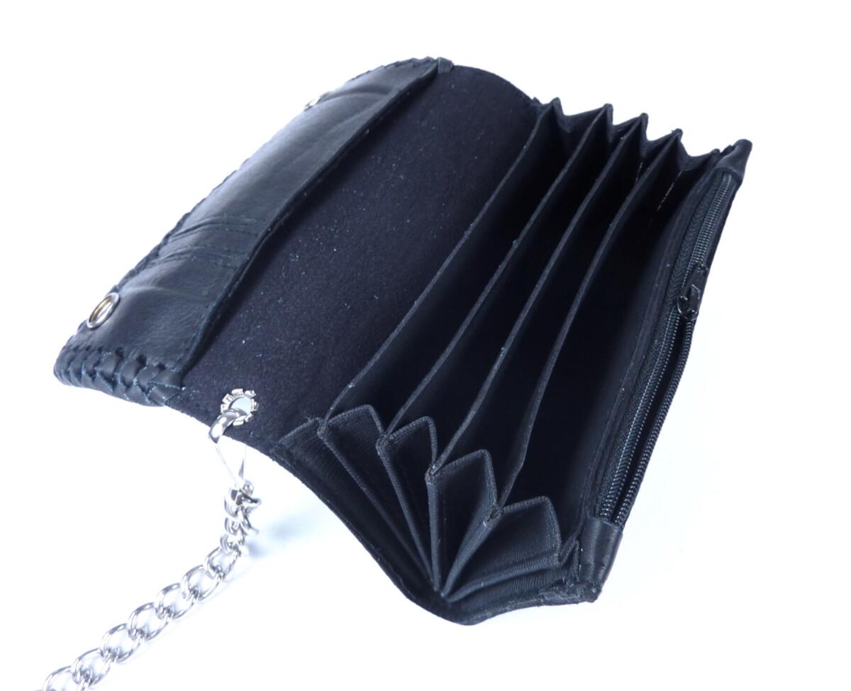 Biker and Trucker leather wallet, attractive design with braided leather edges. Retaining loop made of leather with snap button ideal for attaching and fastening to your belt. The safety hook at the end of the chain neat the leath fastening loop can be used to shorten the chain or to additionaly secure the wallet. Two snap buttons on the outer flap of the wallet to securely close the wallet, three card pockets, five large compartments inside, one coin pocket with zipper. Chain length: apprxo. ca. 30 cm or 12 inches