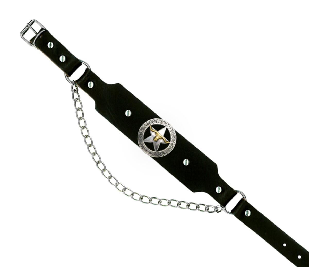 Discover the perfect bootstraps for your Western or biker look! With the Great Western Bootstraps Star Concho in Black, you get a high-quality and stylish boot accessory that adds that extra touch to your outfit. Crafted from durable black leather, these spur straps offer long-lasting durability and high comfort. Adorned with a large, round, silver-colored concho featuring a silver star and a golden bulls head, they are a real eye-catcher. The chain under the boot provides additional stability.
