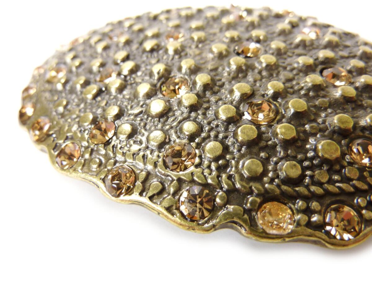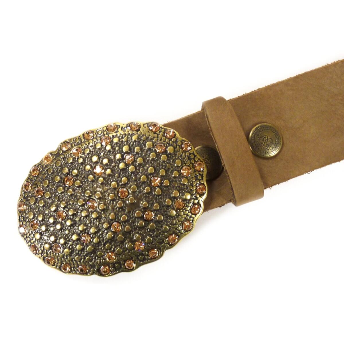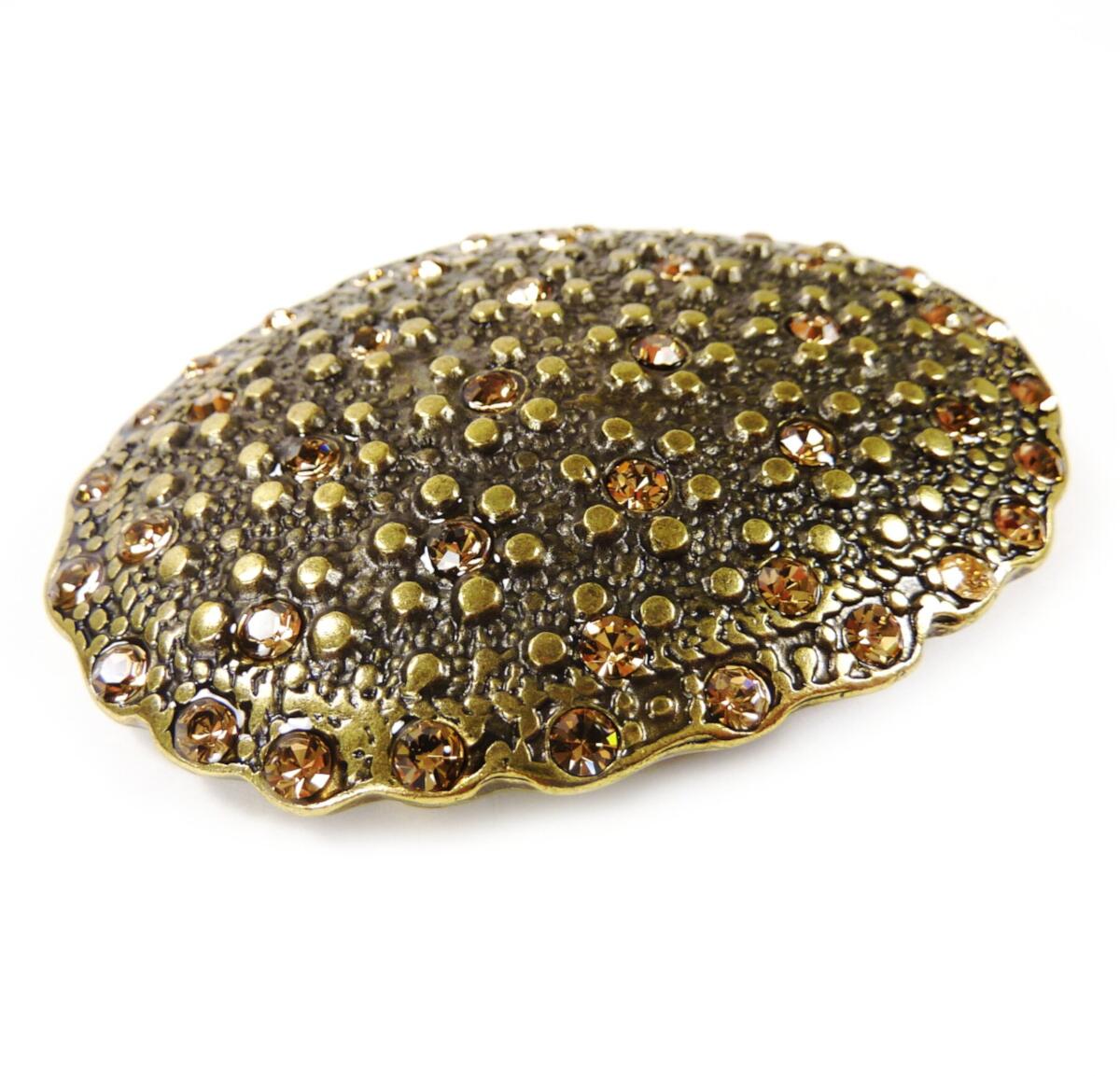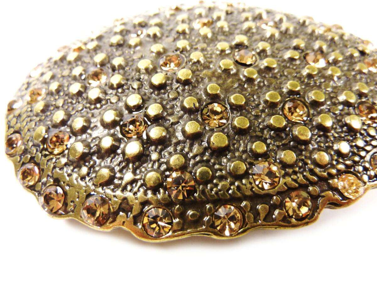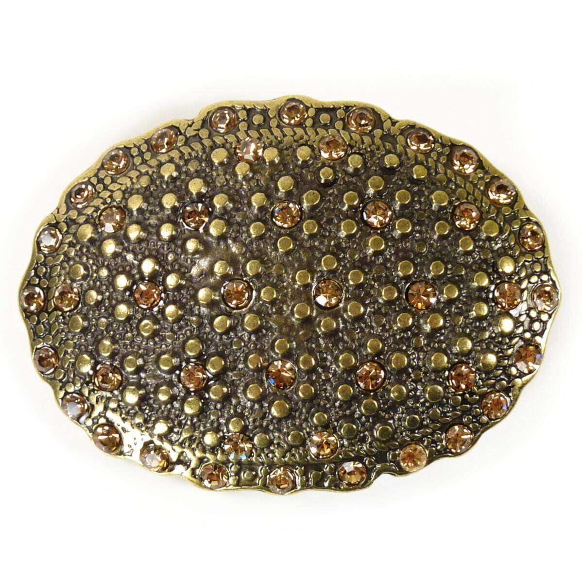 Motiv: besonderer Optik und Haptik (Look and feel) als oval-förmige Gürtelschnalle mit vielen funkelden Steinen.