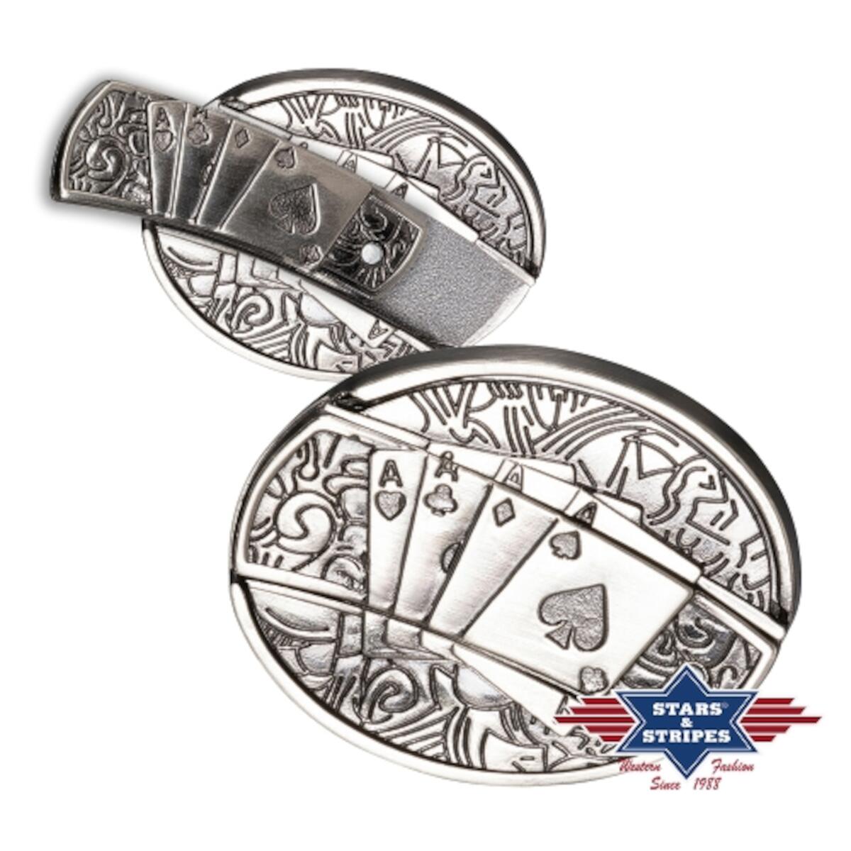 Western-Gürtelschnalle mit Pokerkarten und herausnehmbarem Klappmesser aus Stahl. L: 10 cm,Kl: 5 cm.